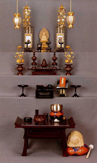 仏壇中央に位置する須弥壇の上に「ご本尊」を、その両脇に「脇仏」をお祀りします。その前に「仏飯器」「茶湯器」をお供えし、五具足(三具足)とよばれる花立、香炉、燭台をならべます。その他、果物やお菓子を供える「高杯(供華)」やお食事を差し上げる「お膳」も用意し、天井からは「灯籠」「輪灯」を下げます。
